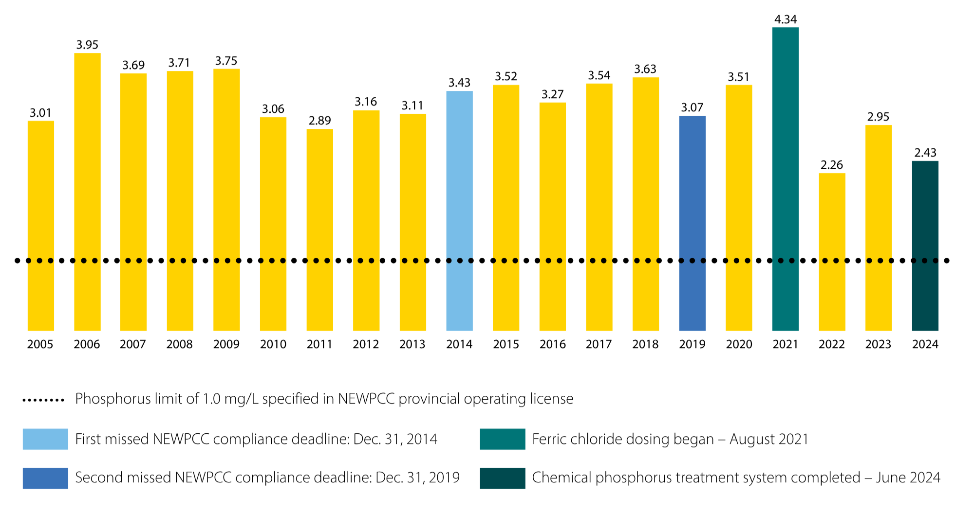 NEWPCC phosphorus concentrations (mg/L) have consistently exceeded the provincial licence limit since public reporting began